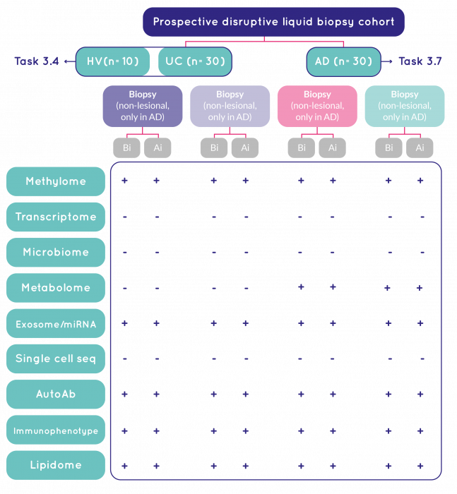 To succeed in this, ImmUniverse is particularly keen to understand the role of the crosstalk of tissue and immune cells in progression/remission of ulcerative colitis and atopic dermatitis and to correlate tissue-derived signatures with circulating signatures detectable in liquid biopsies, using omics technologies. Following this unique and unparalleled approach, ImmUniverse will fill the gap and the limitations of previous investigational approaches, which did not investigate the complex interactions between circulating immune cells and tissue microenvironment. In addition, the parallel study of two different IMIDs will enable the identification of both disease-specific as well as cross-disease signatures and underlying pathological pathways.